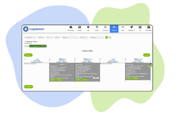 Qu’il s’agisse de projets clients, internes ou d’équipe, Logicake vous offre une vue claire sur l’ensemble. Planifiez, organisez et faites avancer chaque mission avec méthode.